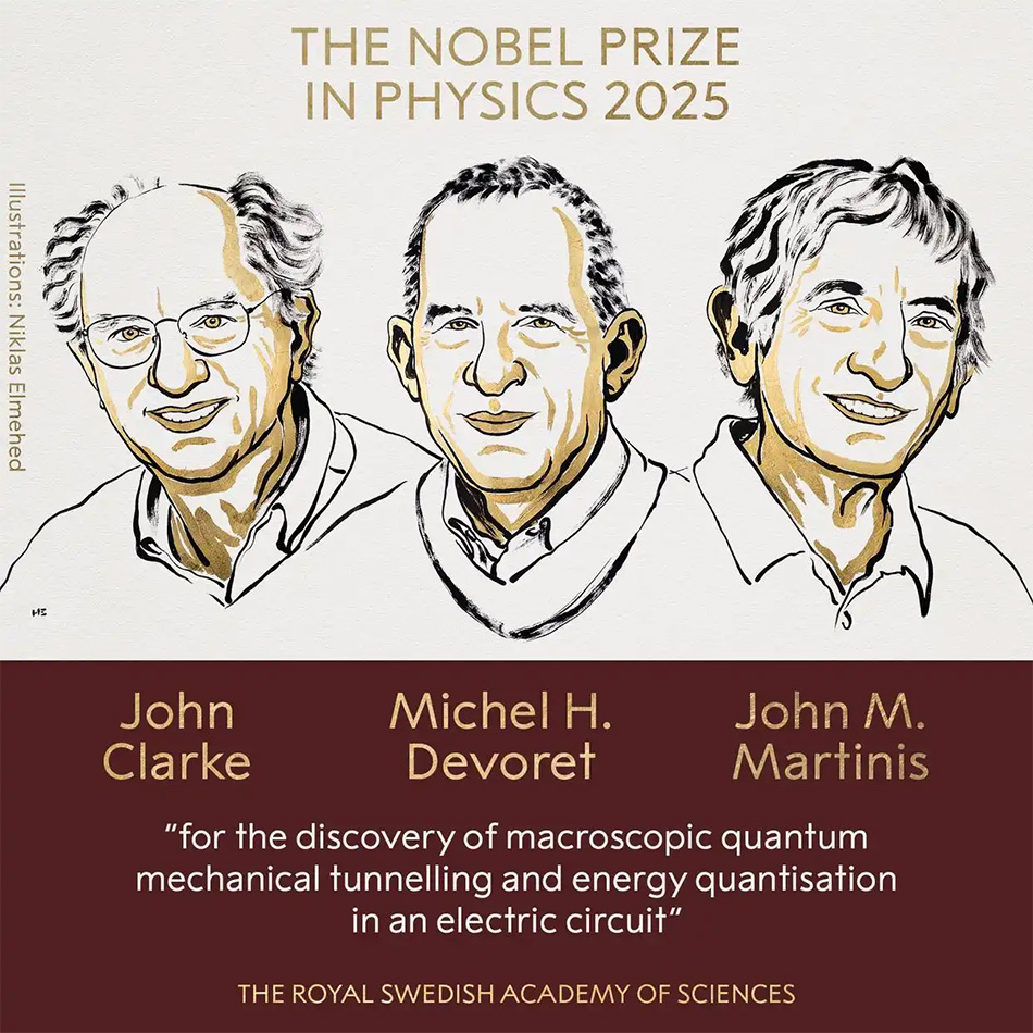 瑞典皇家科学院7日宣布,将2025年诺贝尔物理学奖授予约翰·克拉克、米歇尔·H·德沃雷特和约翰·M·马蒂尼斯,以表彰其“在电路中发现宏观量子力学隧穿和能量量子化”。